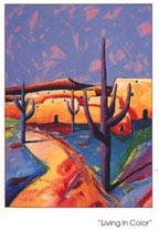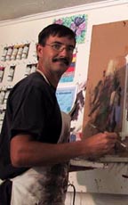 And word travels pretty fast in the art community. Galleries keep their ear to the ground for "Whos Hot?" Thats the term. Once that happened - literally within 8 months, I bet - we were showing in 20-some-odd galleries. I mean they were just like flies. When you "HIT" like that, I mean theyre just calling from everywhere. Wherever theres art galleries around the States, theyre just calling constantly, "Can we carry your work? Can we carry your work?" Chris: I remember, I realized I had made a big mistake when I didnt buy something at that University Plaza show, when I was at some mall, and I was flipping through some Southwest prints and I saw "Downé Burns Important American Artist" on all these prints. Here hes an "Important American Artist," and I was one of the Seven Dwarves with him. [In a school play at Roscoe Wilson Elementary, Downé played Doc and I played Sneezy. chris] Downé: Thats right! Youve got a good memory! Chris: That was my first acting role. Downé: That was my last. Chris: Growing up at Roscoe Wilson and Hutch, you and Shane Bowers were big cowboys - "Grits" - and I just never would have guessed that you would have ended up an artist. You told me you were self-taught; How did you start doing that? I know that your parents owned that graphics print store over there on University. Are your parents artists? How did this all start? Downé: Dad is a self-taught artist. Chris: His name is Doreman, right? Downé: Yea. Doreman Burns. When I was a kid, he always painted - but he just did it for himself, for his own enjoyment. So I was around it, but I didnt do much when I was a kid. He had a little room in the house converted to his studio, and I drew a little bit when hed be back there. Before we had the gift store there on University See, we owned that building - We owned and ran B&B Music. Chris: I remember that now! It was a record store. I bought my first 45 there. Downé: It was a record store; right. Back in that era of Fat Dawgs and all of that, B&B Music was THE record store in that area around the university. So my biggest influence throughout the years was the music. I just grew up around all that music. The record store was there from 68 to 82 And that was my biggest influence. I just grew up around so much music! Everything from Jazz to Rock-n-Roll to Country It was just being in that record store. Then I was naturally exposed to all the locals just trying to get on their feet at that time - Joe Ely, Jay Boy Adams See, at that time B&B Music was really THE top record store in town. So when all the bands would come to town, we sold the tickets - for Pat Benatar or Foghat or whoever - And at that time it was still real common to get in-store record signings, when they were here to play at the Coliseum. So I always got to meet whatever big act was here in town. Thats what Ive said over all the years: I know....I look back; It was the Music. I mean, in the back of my mind, music created a real creative environment that I grew up in. Especially growing up from both sides of it like I did - I saw the marketing side that the musicians went through. When I was a kid I thought I would go into music, to make a long story short. But once I graduated high school and I realized I couldnt really sing and I couldnt play an instrument....And dad had always painted, so Bingo! I had determined that I was gonna do something creative so I thought, "Ill just paint!" I mean it was as simple as that; I just thought, "Okay. Im gonna be an artist." I can draw a little bit. So I just started painting. I asked Mom & Dad if I could convert one side of their garage into my studio. Of course, Mom thought I had lost my mind. And Dad was like "Go for it! Cool, you can do it." Of course, everybody here in Lubbock goes over to Santa Fe