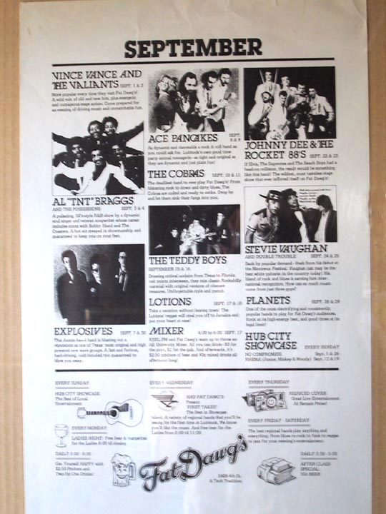 I have a masters in archeology, and I am very familiar with the Lake Site. As you mentioned on your tour, it has been continually occupied since the last ice age - roughly 12,000 years making it one of the oldest continually occupied areas in the world. There is a period during the Archaic Period around 3000 BC that is called the "altithermal period", meaning like it's name "high heat". Everywhere you go in North America, when you work through the stratigraphy of cultural remains, you always find the altithermal period devoid of cultural artifacts. But not Lubbock Lake, it was hell everywhere during that time, and areas were depopulated. But not Lubbock Lake. For some reason they stuck around. That Bob Livingston interview straightened out my vague memories of the "Sparkles". I was in too young to get out to parties, but in Anton where I lived, the local band (the Vandals) there modeled themselves specifically on the "Sparkles". They were a huge influence on garage bands at the time. Mike Buck, drummer for Leroi Brothers and many others and works at Antone's Records, once did a guest shot on KUT - he still does fill in for Paul and Larry. and he did a show on Texas garage Rock. I still have the tape and the Sparkles are the best on the tape, right up there with 13th Floor Elevators. Monty Subject: Re: Cotton Club Date: Mon, 18 Mar 2002 17:57 EST People would pee off the outside chain link beer garden at the Cotton Club. It had a sort of alley behind it. I had a date to hear Ely and she was a nice young sorority girl and really didn't want to go out there, but she knew Joe Ely from frat parties so I promised her that everything would be ok. We had to take her car for some reason. I drove down the alley behind the club looking for a place to park and there was about 25 guys with their dicks poking through the fence, peeing on the side of the car as we drove down. She took it pretty well, but that was her first Cotton Club Experience. Monty |